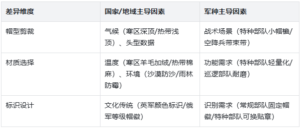 摘要: 奔尼帽因国家气候文化、军种战术需求,在帽型、材质、标识等差异显著:英标准化且配色...